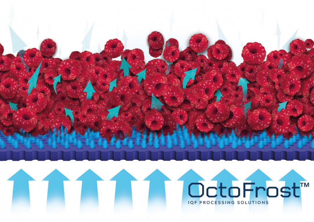 OctoFrost™ IQF tunnel freezer benefits include reliable food safety, natural appearance of the frozen food product, energy efficiency, and a high yield. Each of these benefits is a direct result of the ingenious design features and technology of the OctoFrost™ IQF freezer. The natural appearance of the frozen products is possible due to the gentle fluidization on the OctoFrost bedplates which use asymmetrical movement to gently separate the products and efficiently freeze them.